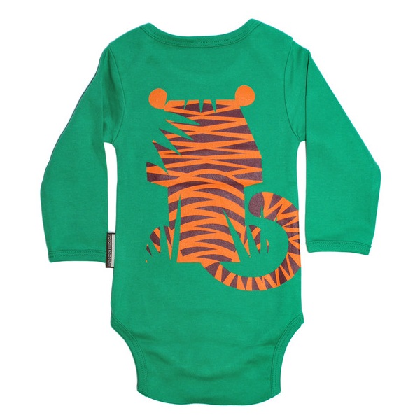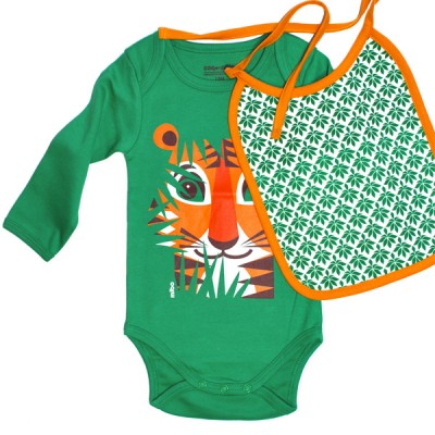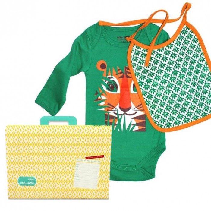 This set will make a wonderful baby boy gift. The clothes are made in beautiful organic cotton. It comes in a handy size 12-month as mums tend to get a lot of clothes in newborn size. Having a bodysuit paired with a bib make it a great present for future happy eater. The bodysuit front displays the front of the tiger in a beautiful jungle scene whilst the back shows the reverse of tiger with his stunning long tail. The yellow cardboard suitcase makes a great packaging for these wonderful presents.