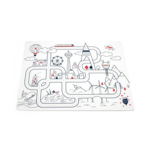 - One easy to clean city placemat in soft silicone to draw on, to colour in and to play with his/her toy cars