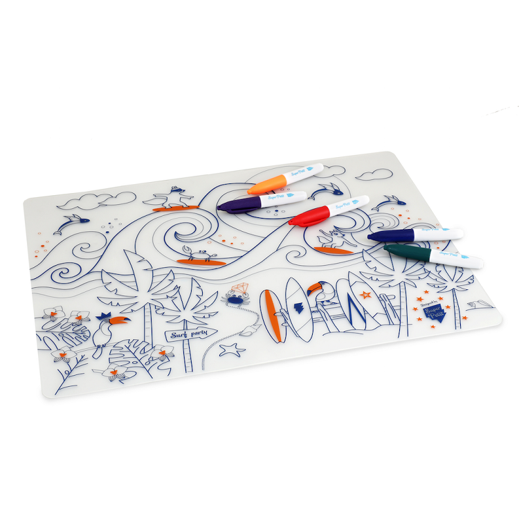 - One easy to clean surf placemat in soft silicone to draw on and on and on palm trees, surfboards…